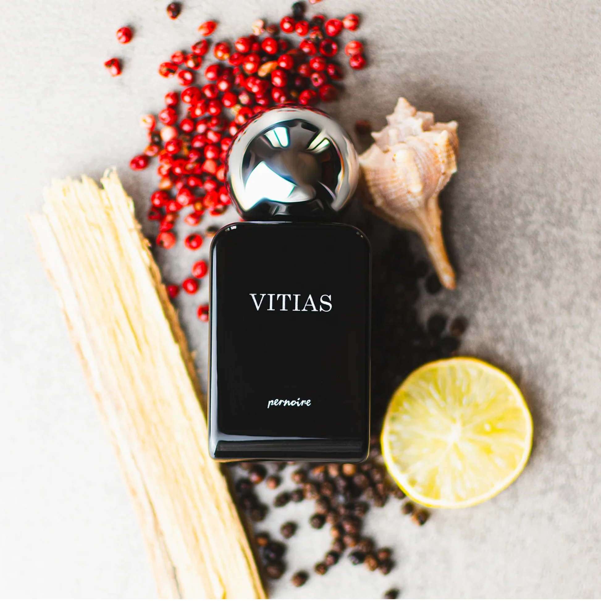 Vitias is a fresh aromatic-aquatic composition inspired by the depth and vastness of the ocean. It opens with bright bergamot and lime, sharpened by pink and black pepper for a crisp, invigorating start. The heart introduces marine notes blended with angelica root and iris, adding a clean, slightly powdery and green nuance, supported by blond woods and guaiac wood. The base settles into a smooth, saline finish built around ambergris and white musk, giving the fragrance a refined, airy depth.